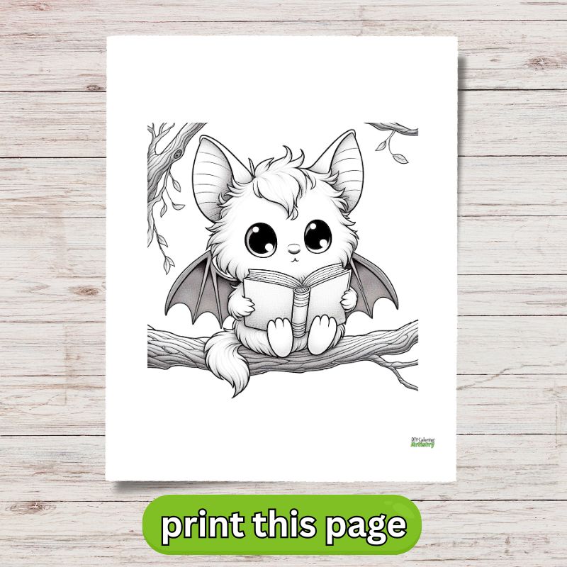 A fun, simple bat coloring page to help you relax. Print it at home and enjoy coloring this cute flying creature. Make this bat really pop with dark gray or black colored pencils and a touch of white gel pens for highlights on the wings. Try using purple or deep blue for the night sky behind it to give it a mysterious forest vibe. You can even add tiny stars with a white pen or gel to make the scene magical.